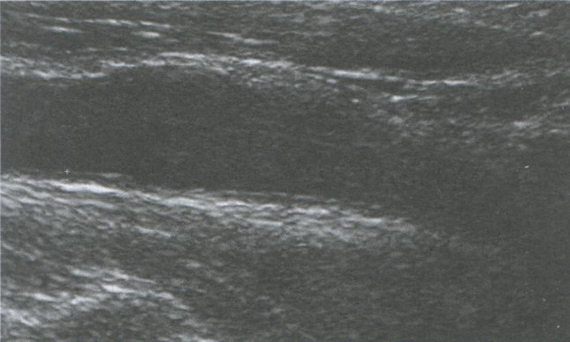 Толщина комплекса интима-медиа в норме до 1 мм, на бифуркациях допускается утолщение до 1,1 мм. Эхогенность интимы в норме сопоставима с эхогенностью окружающих тканей, эхогенность медии близка к эхоплотности крови в просвете артерии (рис. 3.1.2). Степень дифференцировки на слои в норме четко выражена, при атеросклерозе и других заболеваниях утрачивается. Форма поверхности в норме ровная, если она неровная, это говорит о нарушении целостности эндотелия. В норме структура сосудистой стенки на всем протяжении одинаковая, при различных заболеваниях она может изменяться.