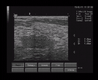Молочные железы симметричные, больших размеров, кожные покровы не изменены, втяжение сосков не отмечается. Позадисосковая область визуализируется в косых проекциях, типичного строения. В проекции левой молочной железы, на границе верхнего и нижнего наружных квадрантов на 15 часах, в 2 — 3 см от сосковой области, на глубине 17 мм лоцируется. гипоэхогенное образование 27 х 15 мм, имеющее неправильную форму с горизонтально ориентированной осью, имеющее неровные четкие границы, однородное внутреннее строение за исключением двух гиперэхогенных включений размерами 2 — 3 мм. На остальном протяжении дифференциация тканей молочных желез хорошая, архитектоника не нарушена. Молочные железы представлены фиброгландуллярной и жировой тканью. Млечные протоки диаметром 1-3 мм, главный млечный проток левой молочной железы расширен до 4-5 мм.