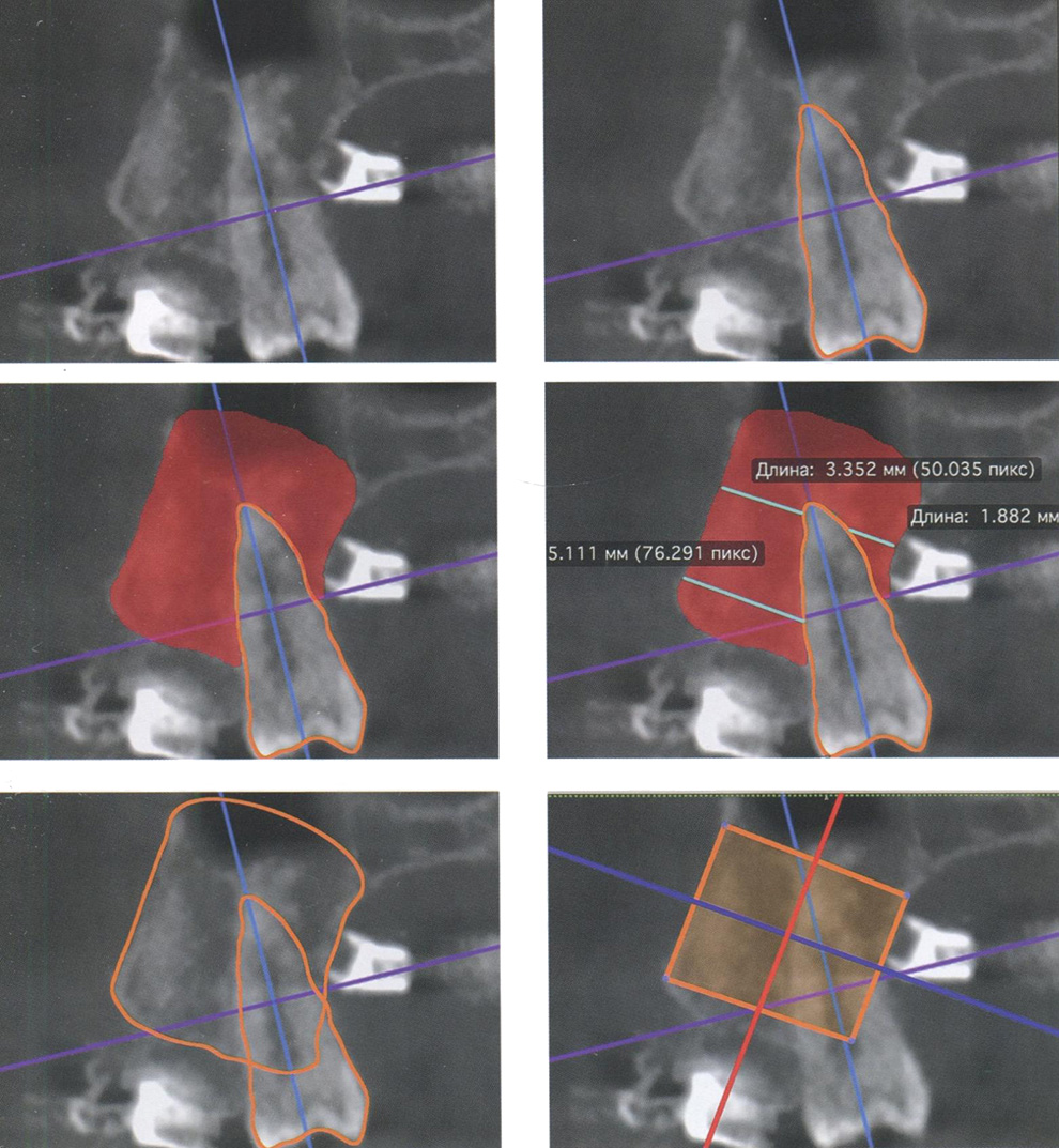 Рис. 82. Оценка положения зуба 2.1 с помощью углового параметра на компьютерных томограммах в окне мультипланарной реконструкции