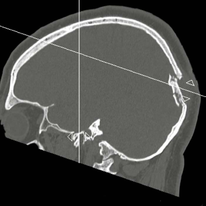 На снимке по МСКТ костей черепа определяется депрессионный вдавленный перелом затылочной кости (обозначено стрелкой)