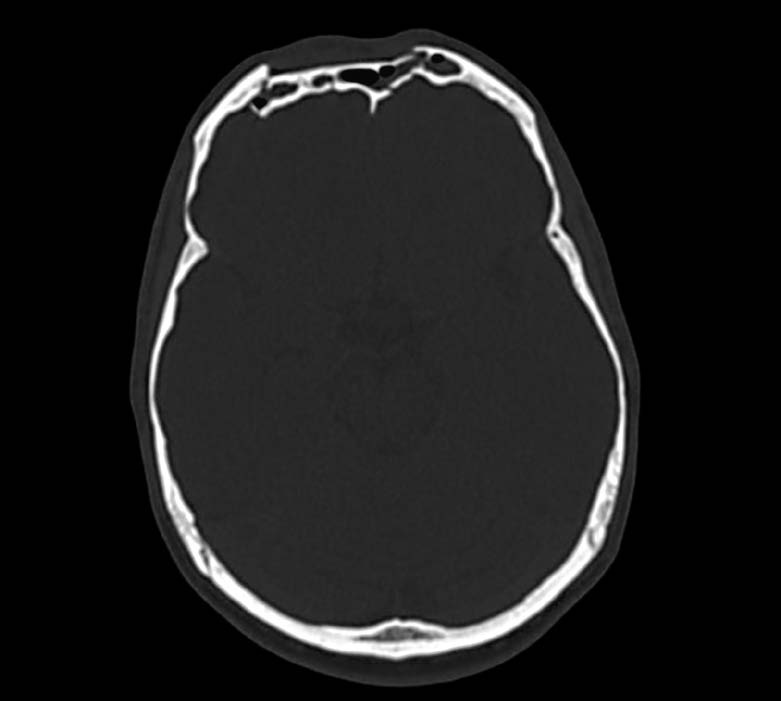 На снимке по МСКТ головного мозга в аксиальной проекции определяется депрессионный вдавленный многооскольчатый перелом лобной пазухи.