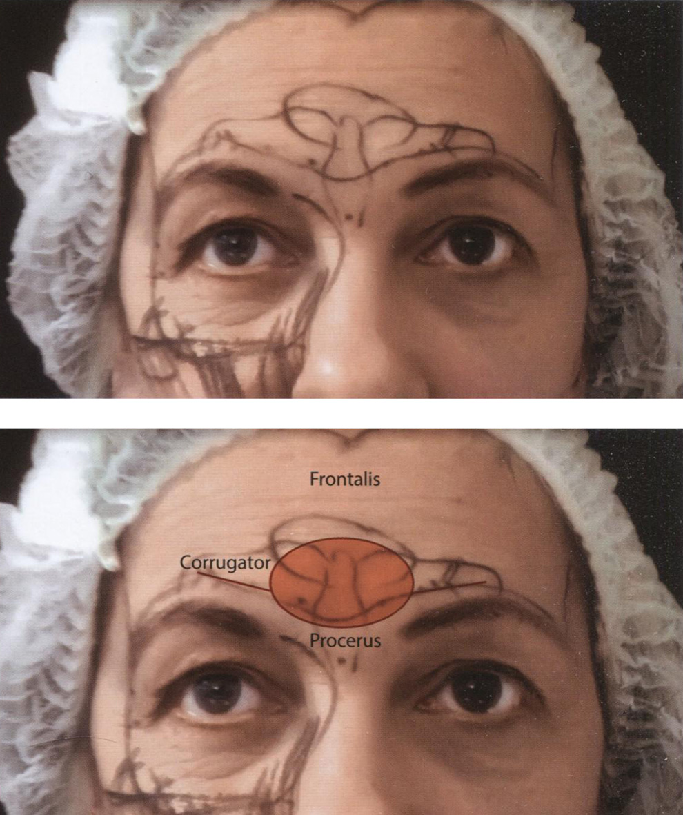 В этой зоне глубина инъекции в мышцы депрессоры должна быть достаточной, чтобы препарат не затронул поверхностные волокна m. frontalis.