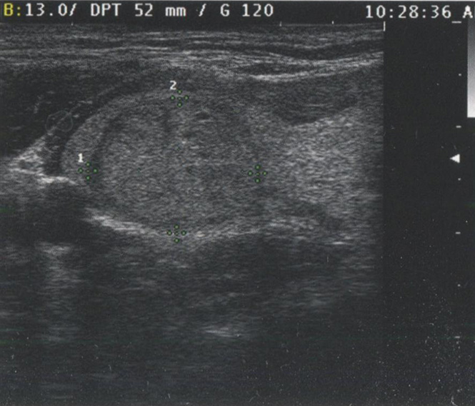 Рис. 2.14. Усиление сигнала. Этот доброкачественный коллоидный узел содержит много жидкости и коллоида, что приводит к уменьшению клеточного компонента. Сниженное затухание сигнала в узле обусловливает усиление сигнала, несмотря на то что этот узел является солидным